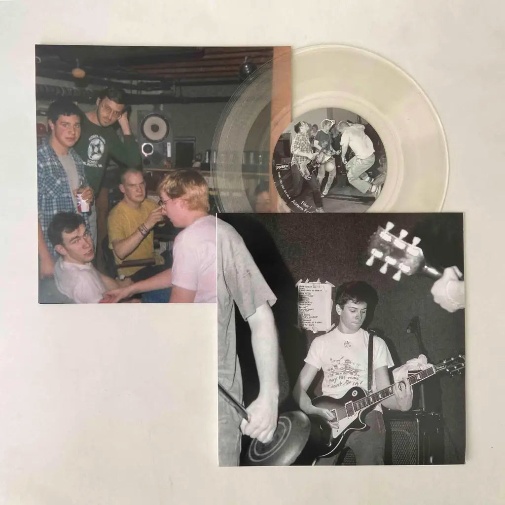 "In January 1983, Minor Threat went into Inner Ear Studio for the first time as a five - piece (Brian Baker had moved from bass to second guitar and Steve Hansgen was now playing bass). They had six new songs that would end up being the centrepiece of what became the ‘’Out of Step’’ 12" EP. The band had also decided to re-record the song "Out of Step" with some extra language to try to clarify the lyrics, as well as "Cashing In", a tongue-in-cheek song about the DC punk scene which they had only played live once. After much debate, "Cashing In" was added as a hidden track on the original vinyl release though not listed on the cover or label. There was still blank tape on the reel, so they decided to record an instrumental with the working title, "Addams Family" and then recorded new versions of "In My Eyes" and "Filler" to hear what they sounded like with two guitars. "Addams Family" ended up being used as a coda to "Cashing In", but the other two songs were never mixed and largely forgotten for over 35 years until the multitrack tapes were taken into the studio to be digitized in 2021. Surprised by the discovery, Ian and Don Zientara mixed the two songs along with the complete take of "Addams Family". These outtakes are now being released on a 7" to mark the 40th anniversary of the release of ‘’Out of Step’’."