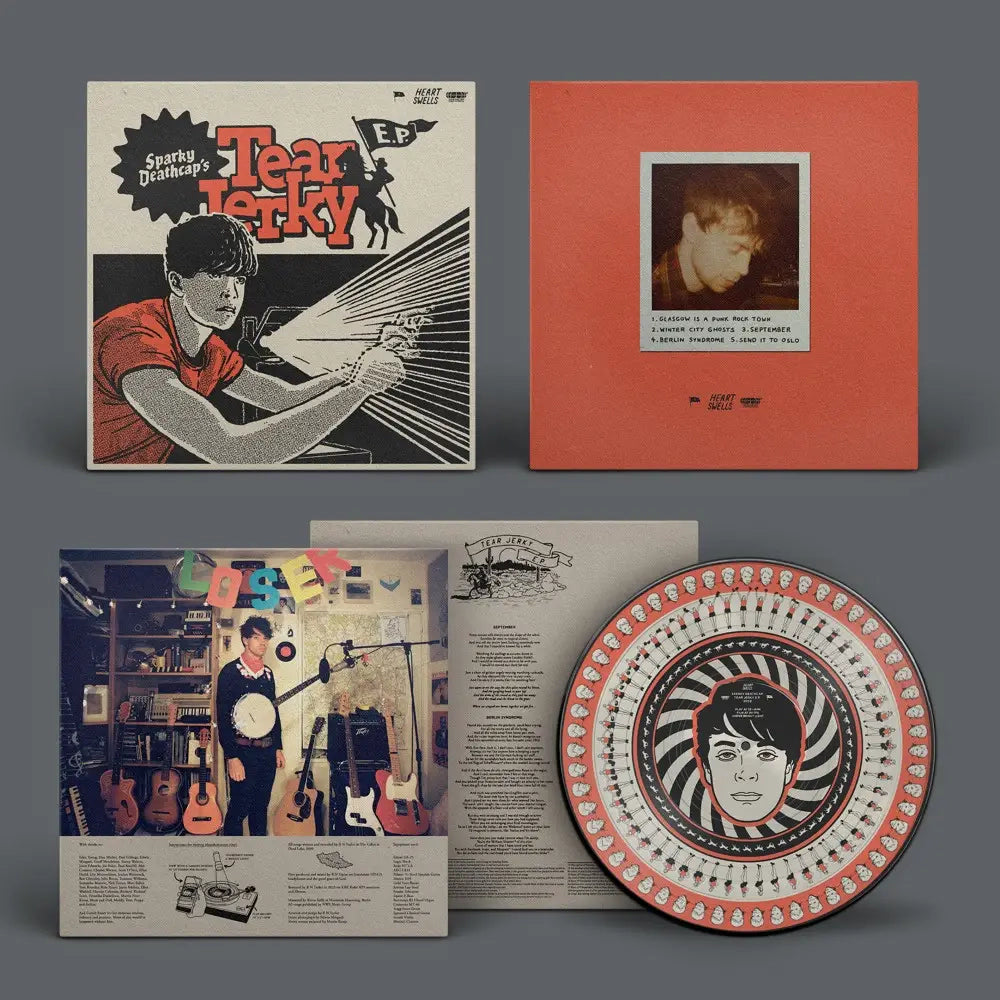 "Sparky Deathcap AKA Los Campesinos! multi-instrumentalist R N Taylor is the first to admit he’s an unlikely candidate for viral stardom. And yet, almost 15 years on from his final EP, Taylor’s alt-folk solo project is now getting a much-deserved reappraisal, entrancing a whole new generation of listeners. Championed by prominent Twitch streamer/YouTuber Wilbur Soot, his beautifully bruised pocket symphony ‘September’ has racked up over 36m streams on Spotify and soundtracked more than 750,000 creations on TikTok. Now, Los Campesinos!’s own indie imprint Heart Swells are delighted to release a newly mixed edition of its parent EP, Tear Jerky. Musically, you can trace the influence of Phil Elverum’s Microphones, of Magnolia Electric Co and Sufjan Stevens, and of Ys-era Joanna Newsom. From the beautifully lo-fi baroque-pop of ‘Glasgow Is A Punk Rock Town’ to ‘Send It To Oslo’s’ maximalist mix of analogue sounds, these ambitious yet intimate compositions prove the perfect foil for deeply autobiographical tales of heartbreak and recovery."
