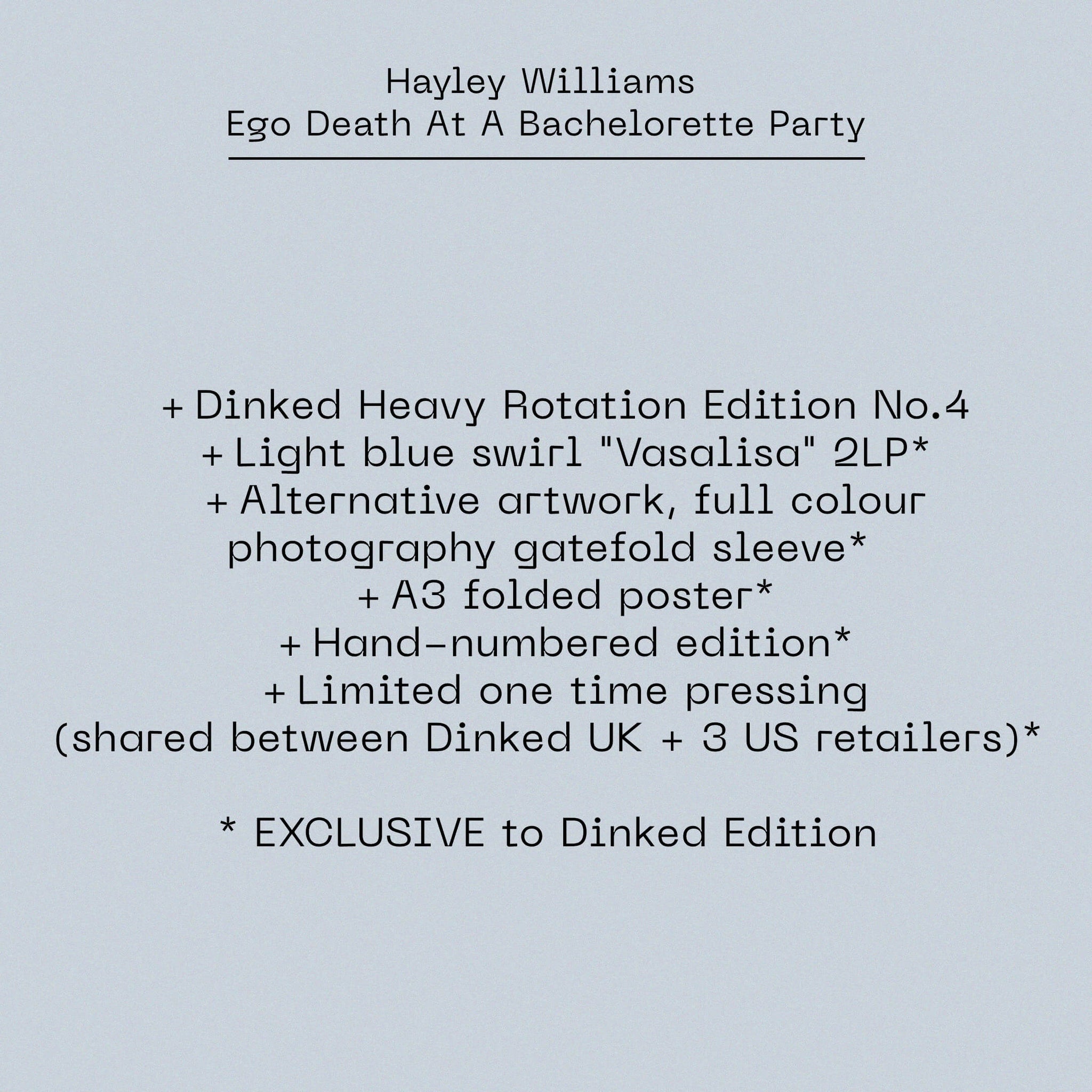 HAYLEY WILLIAMS - EGO DEATH AT A BACHELORETTE PARTY VINYL (SUPER LTD. 'DINKED' HAND-NUMBERED ED. LIGHT BLUE SWIRL 'VASALISA' 2LP W/ ALT. ARTWORK GATEFOLD + A3 POSTER)