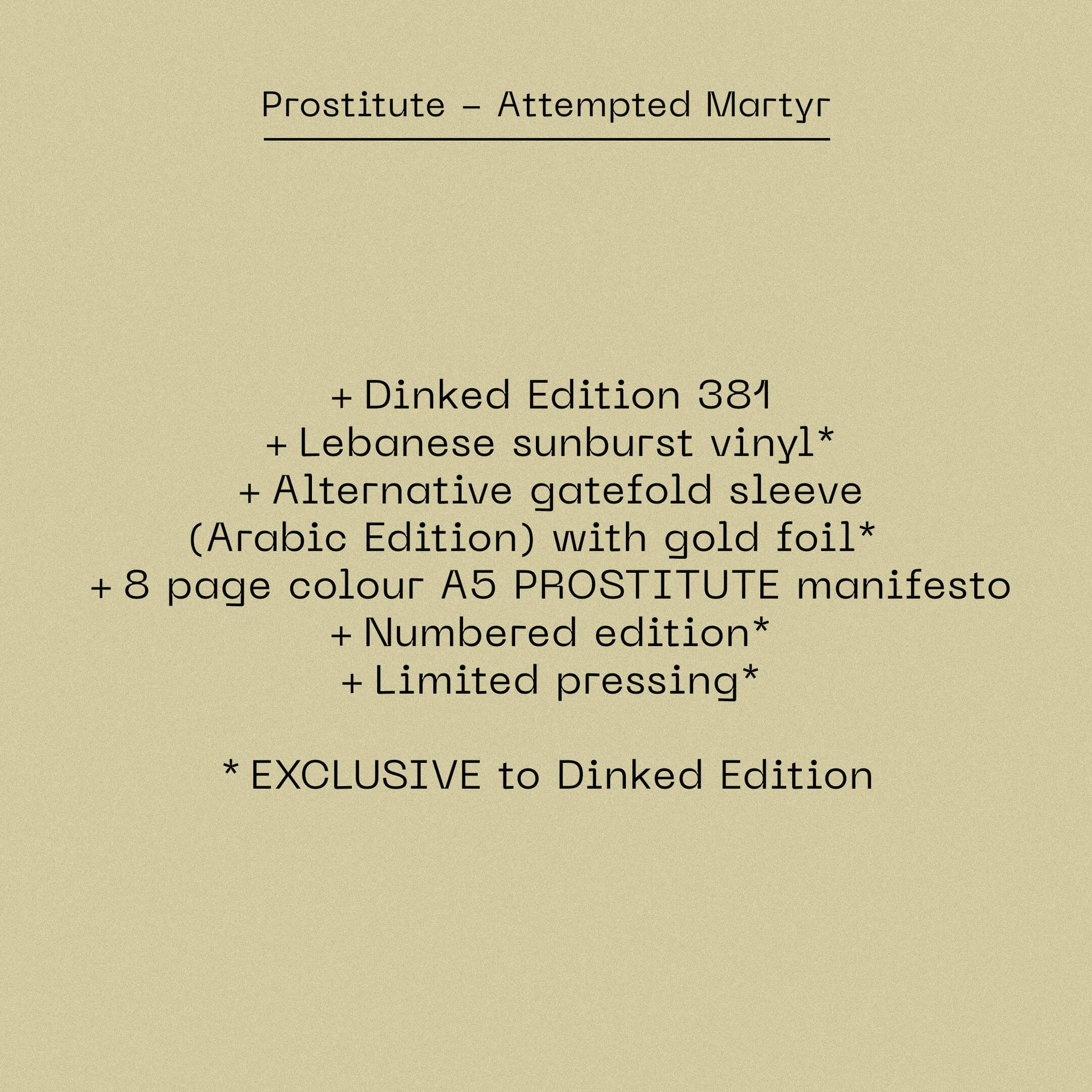 "Emerging out of Dearborn, Michigan, this five-piece deal in pure chaos and catharsis - fiery live shows, razor-sharp intensity, and a sound that’s as incendiary as it is brutally tight. Their name reflects their fixation on identity, desperation, and survival under late capitalism. Attempted Martyr was written in the midst of global and personal turmoil, capturing the zeitgeist of a world unraveling. A loose concept record, it chronicles the rise and fall of a doomed zealot whose pursuit of holy vengeance spirals into a psychotic orgy of violence, greed, and lust. It’s dense, turbulent, and charged with blaring Middle Eastern, African and East Asian influences - all scorched into shape by producer Chris Koltay (The Armed, Mdou Moctar). With mounting online buzz, critical acclaim and a run of sold-out bootleg editions, Prostitute’s debut continues to gain momentum."