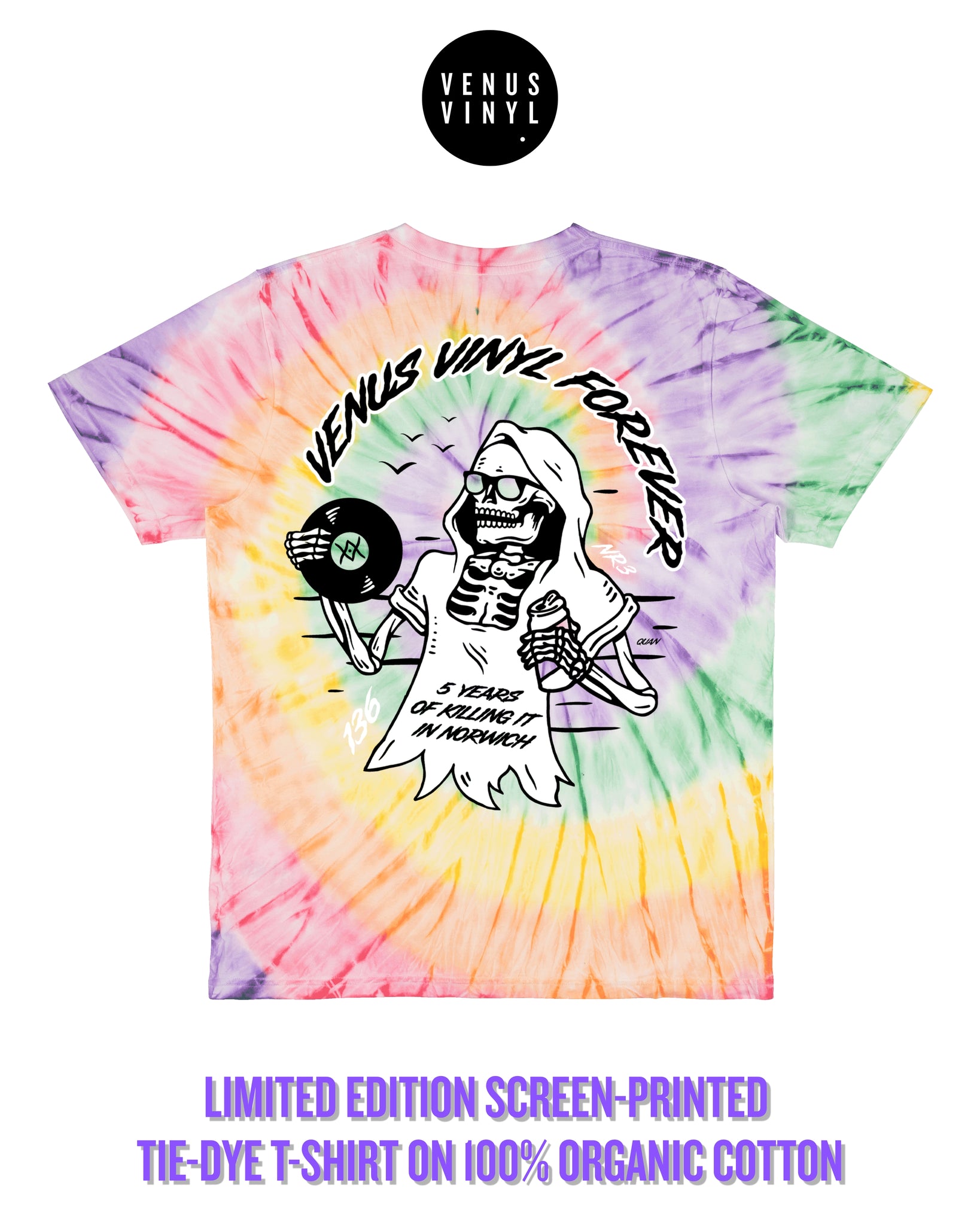 5 YEARS OF KILLING IT IN NORWICH VENUS VINYL TIE-DYE T-SHIRT DOUBLE-SIDED DESIGN (LTD. ED. ECO SCREEN-PRINTED 100% ORGANIC COTTON)