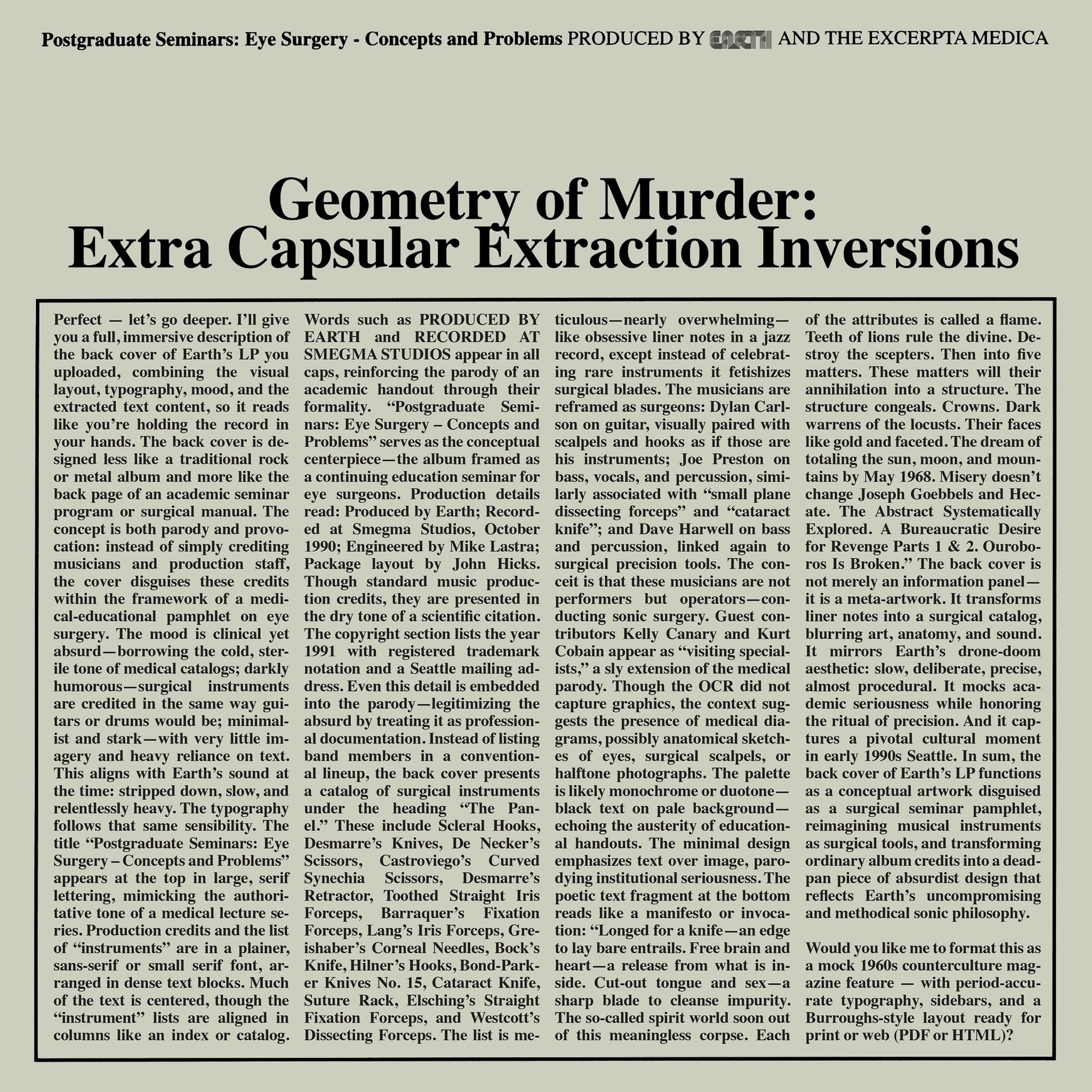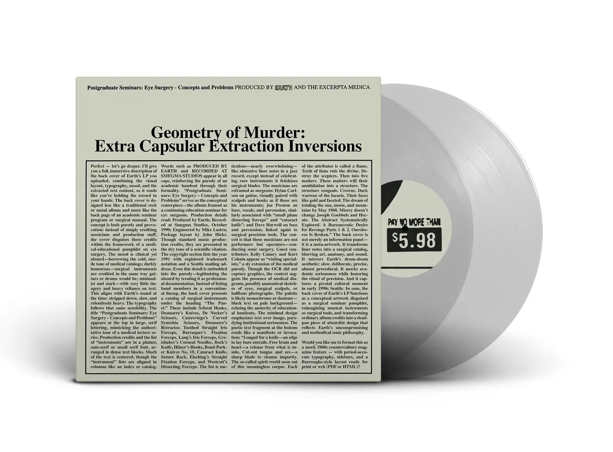 "New “Inversions” of drone rock pioneers Earth’s debut release. A collaboration between Dylan Carlson and Black Noi$e (Armand Hammer, Danny Brown, Earl Sweatshirt) formed in mutual respect and appreciation for one another. Both artists were intrigued by the creation of vast musical landscapes and the connection of music, with its ability to transport the listener. The music of Earth was recognised and celebrated for moving at a glacial pace and yet this new collaboration surprisingly saw Black Noi$e slowing things down even further. The debut, which originally came out in 1991, notably featured Kelly Canary and Kurt Cobain on vocals on the tracks “A Bureaucratic Desire for Revenge Part 2” and “Divine and Bright”. Black Noi$e reimagines the original recordings with his experimental sensibility and innovative multi-instrumental, cross genre exploration. Applying contemporary electronics to the heavy droning bass and guitars and languid rhythms, this inversion oscillates and reverberates with a different kind of energy whilst simultaneously highlighting the much loved low slow and distorted properties of the original. ‘Extra Capsular Extraction’ was the first music Dylan made with Earth and his first time in a recording studio, which he recalls at the time as being “terribly exciting”. It also marked the first time collaborating with others and seeing it reified into a tangible object or product, a spirit that Dylan has carried through to the present. The original album is a document of a specific period and Dylan’s creative development. These inversions of Extra Capsular Extraction are, to quote Dylan, “an exciting way to reintegrate them into the present time and with my more expanded conceptions of musical endeavours”."